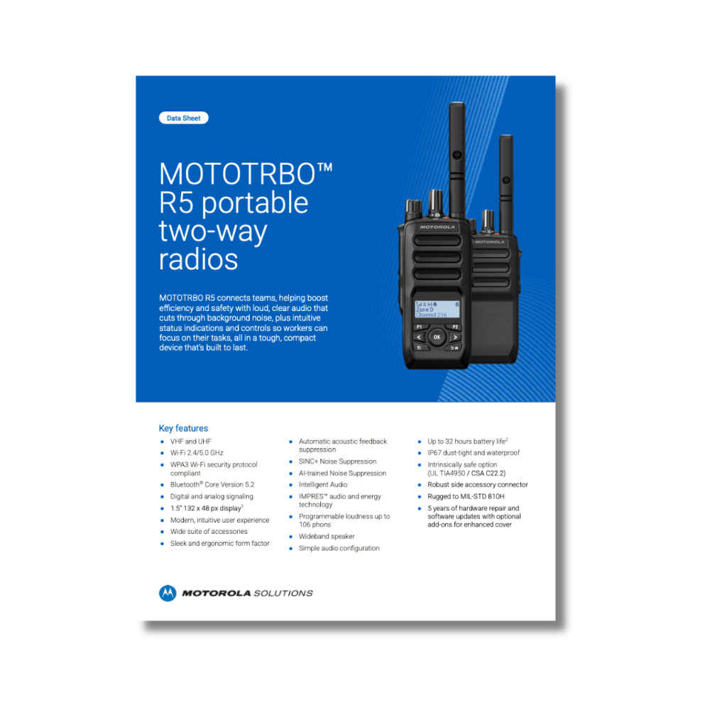 The MOTOTRBO R5 keeps your team connected, safe, and efficient. With loud, clear audio that cuts through background noise, intuitive status indicators, and easy-to-use controls, the R5 helps workers stay focused on the task at hand — not the technology in their hands. Built for tough environments yet compact enough for everyday use, the R5 is the reliable solution your team can count on.